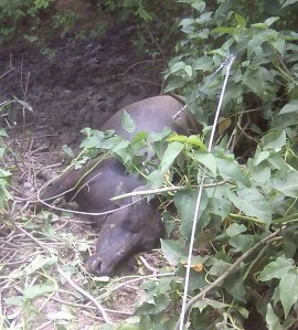 कोंच-उरई। आज सुबह चंदुर्रा गांव में खेत पर चरने जा रही एक व्यक्ति की भैंस पर एलटी लाइन का तार टूट कर गिरा जिससे उसकी मौके पर ही मौत हो गई। भैंस मालिक ने तहसील और पुलिस को सूचना दी है। मिली जानकारी के मुताबिक कोतवाली क्षेत्र के ग्राम चंदुर्रा में दौलत पुत्र धनीराम की भैंस आज सुबह चारने के लिये जा रही थी तभी एलटी लाइन का तार उसके ऊपर टूट कर गिरा। तार में करंट होने के कारण भैंस की मौके पर ही मौत हो गई।