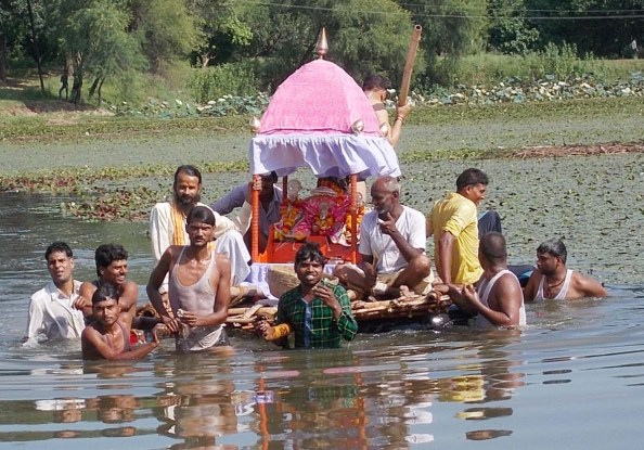 कोंच-उरई । जल विहार के मौके पर शनिवार को धनुताल के मैदान में भारी भीड़भाड़ के बीच नगर के तमाम मंदिरों के गर्भगृह छोड़ भगवान के श्रीविग्रहों ने जलावतरण किया और घंटों धनुताल के पवित्र जल में विहार किया। कई विमानों ने किनारे पर ही पूजा आरती संपन्न कराने के बाद औपचारिक रूप से जल विहार किया जबकि नृसिंह भगवान, रामलला सरकार और सैरा के रामजानकी महाराज ने तालाब में परिक्रमायें लगाईं। नगर पालिका की ओर से तालाब पर सफाई और प्रकाश की माकूल व्यवस्थायें की गई थी।