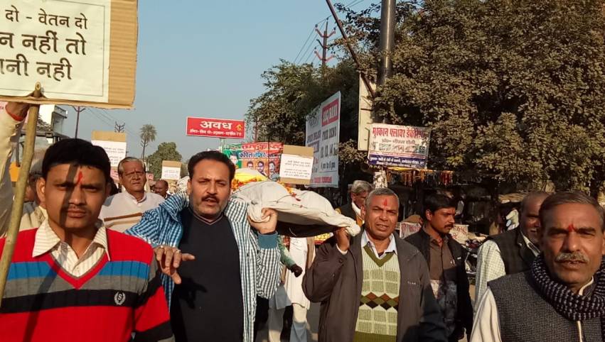 जल संस्थान कार्यालय से भगत सिंह चौराहा तक निकाले गए जुलूस का नेतृत्व मंडलीय मंत्री मनोज कुमार गुप्ता ने किया । वापसी में आंबेडकर चौराहे पर महा प्रबंधक का पुतला फूंका गया ।