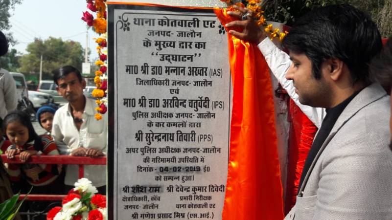 उरई । एट थाने के नव निर्मित मुख्य गेट का विमोचन सोमवार को धूमधाम से समारोह आयोजन के बीच किया गया । थाने की भव्यता में चार चाँद लगाने वाले मुख्य द्वार के उदघाटन पट्ट का अनावरण जिलाधिकारी डॉ मन्नान अख्तर और पुलिस अधीक्षक डॉ अरविंद चतुर्वेदी ने विधि विधान से किया ।