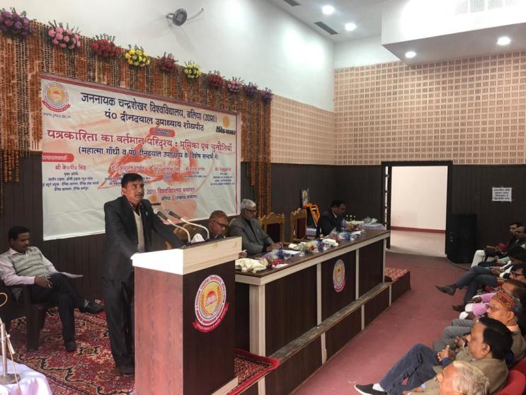 कार्यक्रम की अध्यक्षता करते हुए जननायक चन्द्रशेखर विश्वविद्यालय के कुलपति प्रो डा योगेंद्र सिंह ने विश्व में हो रहे नये परिवर्तनों की चर्चा करते हुए कहा कि बाजारीकरण ने जिस तरह से इस मीडिया को प्रभावित किया है उसके आकलन की आवश्यकता है। इससे पूर्व दीनदयाल उपाध्याय शोध पीठ के समन्वयक डा राजीव कुमार ने अतिथियों का परिचय कराते हुए उनका स्वागत किया ,भास्कर परिवार की ओर से आये हुए अतिथियों व कुलपति को स्मृति चिन्ह, अंगवस्त्रम व बुके देकर सम्मानित किया गया, कार्यक्रम का संचालन डा जैनेन्द्र कुमार पाण्डेय द्वारा किया गया।इ स अवसर पर भास्कर टीम से शैलेश सिंह, रजनीश श्रीवास्तव, दिनेश गुप्ता ,नीरज सिंह, विकास सिंह की सहभागिता उल्लेखनीय रही।