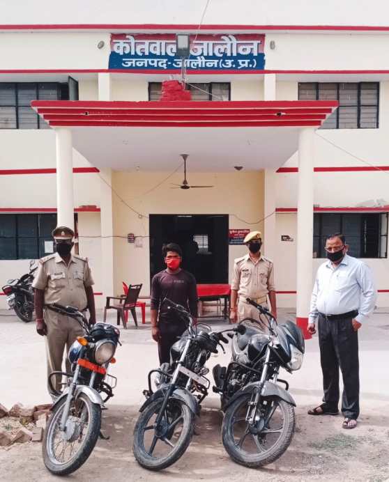 उरई। जालौन कोतवाली क्षेत्र में पुलिस को लाॅक डाउन के दौरान अनायास बडी सफलता मिली है। पुलिस ने एक शातिर बाइक चोर पकड लिया जिसकी निशानदेही पर कुछ महीने पहले चोरी की गयी तीन मोटर साइकिल बरामद हो गयी है।