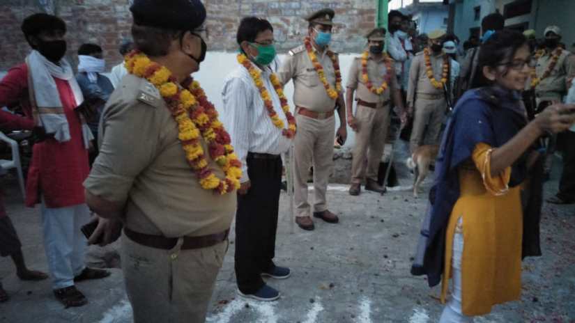 नगर के संतोषी माता मंदिर वाली गली में एसडीएम सालिकराम, सीओ संजय शर्मा, कोतवाल जेपी पाल और पुलिस जवानों का पहले घर के दरवाजे से गली के अंतिम छोर के दरवाजे तक पुष्प वर्षा और माला पहनाकर भव्य स्वागत किया गया। शोभित गुप्ता, लला सोनी, गुलशन, गोपालजी, सक्षम, उज्ज्वल, तानिष, माही, मोहन, लालू सोनी, शिवांग,सचिन आदि छोटे-छोटे बच्चों ने पूरी गली में कोरोना योद्धाओं के लिए स्वागत के गीत लिखे तो गली महिला पुरुष, युवाओं बुजुर्गों ने अपने दरवाजों पर खड़े होकर दोनों ओर से पुष्प वर्षा कर गली को फूलों से पाट दिया। दीक्षा तरसौलिया ने कोरोना योद्धाओं के सम्मान में एक सलाम जो सुरक्षा को चौराहों पर खड़े हैं को गाकर उनका मान बढ़ाया तो एसडीएम और सीओ ने तालियां बजाकर आभार प्रकट किया। मिथिला शरण गुप्ता, जगदीश सोनी, बृजमोहन लहारिया, सतीश तरसौलिया, आशीष विश्नोई ने फूलमाला पहनाई तो माही गुप्ता ने कोरोना से बचाव की अपने हाथों से बनाई कलाकृति भेंट की। अवधेश गुप्ता ने मीडिया कर्मियों डा. विनोद कुशवाहा, मोनू शर्मा, मनोज शिवहरे, दीपक उदैनिया को माला पहनाकर स्वागत किया। कोरोना योद्धाओं को जलपान चैयरमेन राजकिशोर गुप्ता ने कराया।