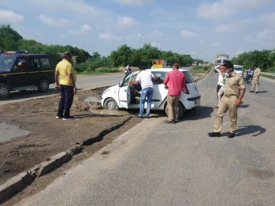 कालपी। गुरुवार सुबह कालपी कोतवाली क्षेत्र के अंतर्गत झांसी कानपुर नेशनल हाइवे पर जोल्हूपुर मोड़ के समीप एक पिता व पुत्री कार से कानपुर की ओर जा रहे थे तभी हाइवे पर जाम लग जाने के कारण कार चालक पिता अपनी गाड़ी को डिवाइडर पर चढ़ाकर दूसरी ओर निकालने लगा लेकिन डिवाइडर पर पानी व गीली मिट्टी होने के कारण गाड़ी फंस गई। कार सवार करीब तीन घंटे तक डिवाइडर में फंसे रहे। वहीं राहगीरों से मदद भी मांगी लेकिन किसी ने मदद नहीं की।