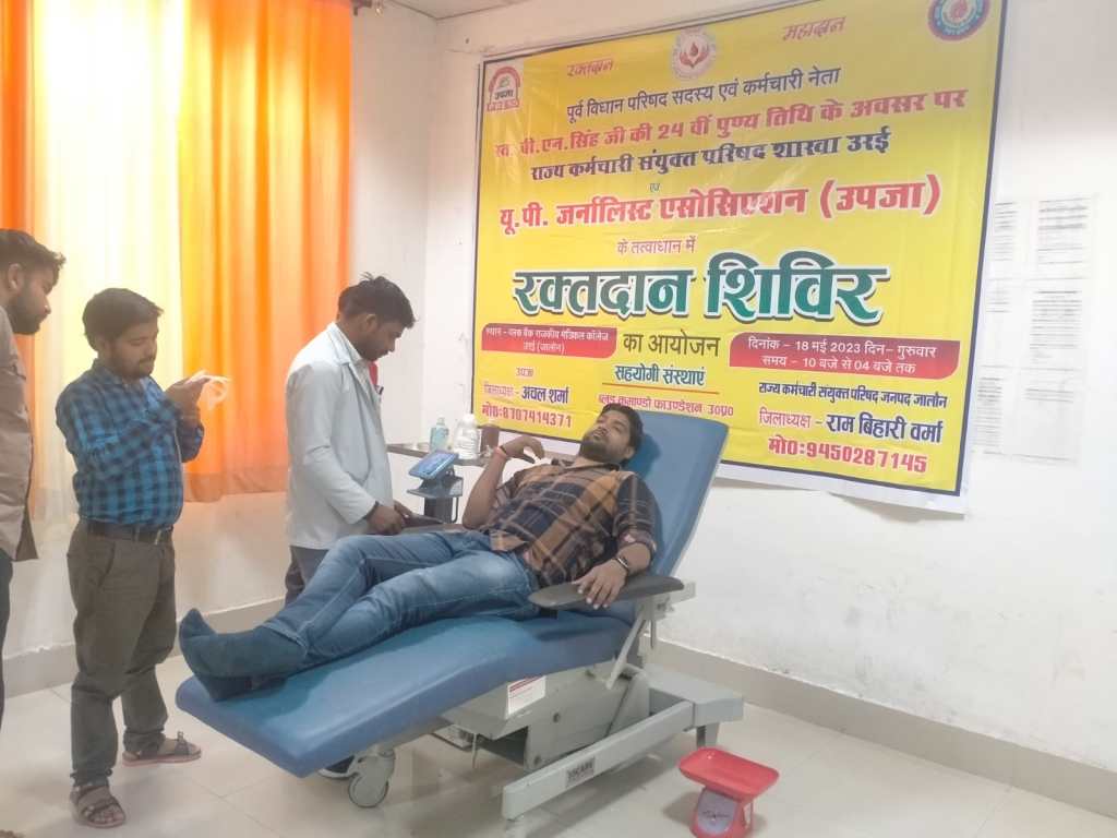यूपी जर्नलिस्ट्स एसोसिएशन उपजा, राज्य कर्मचारी संयुक्त परिषद व ब्लड कमाण्डो फाउंडेशन के संयुक्त तत्वाधान में आयोजित शिविर में उन्होंने कहा कि आप किसी की जान बचाने का काम कर रहे हैं, इससे जरुरत मंद लोगों की मदद होती है, रक्तदान महादान है। मेडीकल कालेज के प्राचार्य डॉ. राजेश कुमार मौर्य ने कहा कि आप लोग ज्यादा से ज्यादा लोगों को रक्तदान के लिए प्रेरित करें। क्योंकि समाज में ऐसी भ्रांतियां फैली हैं कि रक्तदान से कमजोरी आती है। जबकि सच्चाई यह है कि रक्तदान से हमारे शरीर की सफाई होती है। सीएमएस प्रशांत निरंजन ने कहा कि रक्त दान करने से दिल की बीमारियों और स्ट्रोक का खतरा कम होता है। खून में आयरन की ज्यादा मात्रा दिल के दौरे को बढ़ा सकती है। नियमित रक्तदान से आयरन की अतिरिक्त मात्रा नियंत्रित रहती है। कार्यक्रम को डॉ. जितेंद्र मिश्रा, ब्लड बैंक के प्रभारी डॉ. माशूक सिद्दीकी, उपजा के जिलाध्यक्ष अचल शर्मा, राज्य कर्मचारी संयुक्त परिषद के जिलाध्यक्ष रामबिहारी वर्मा, ब्लड कमाण्डो फउंडेशन के संस्थापक शुभम अग्रवाल व राघवेंद्र सिंह ने भी संबोधित किया। कार्यक्रम का संचालन अजय सोनी ने किया। इस दौरान बीस लोगों ने रक्तदान किया व तीस लोगों के रजिस्ट्रेशन किए गए। इस मौके पर उपजा से महेश प्रजापति, अलीम अहमद, आशुतोष द्विवेदी, विकास गुप्ता, नीरज प्रजापति, शंकर शुक्ला, मनोज सैनी, रोहित सोनी, रामजी व्यास आदि लोग मौजूद रहे।