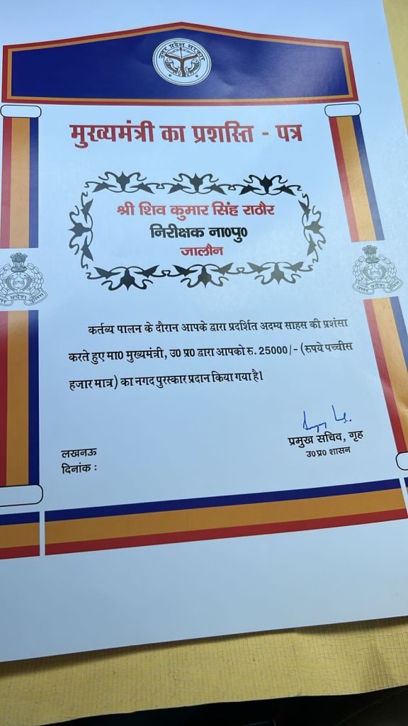 एडीजी जोन आलोक कुमार सिंह ने अपने कानपुर स्थित कैंप कार्यालय में आयोजित स्वाधीनता दिवस समारोह के दौरान शिवकुमार सिंह राठौर को मुख्यमंत्री की ओर से भेजा गया प्रमुख सचिव गृह के द्वारा हस्ताक्षरित प्रशस्ति पत्र व 25 हजार रुपये का नगद पारितोषक दिया। कुछ समय पहले शिवकुमार सिंह राठौर के साथ एक बड़ा हादसा हो गया था। जिसमें उनके इकलौते विवाहित पुत्र की असामायिक मृत्यु हो गई थी और पत्नी समेत स्वयं वे भी गंभीर रूप से घायल हो गये थे। एडीजी जोन ने इस अवसर पर पुनः उक्त हादसे को लेकर उन्हें ढांढस बंधाया। एडीजी जोन ने कहा कि आपका समूचा कैरियर कर्तव्य पालन के लिए उत्कृष्ट समर्पण का है। जिसके कारण आपकी सेवाएं विभाग के लिए अत्यंत मूल्यवान हैं। उन्होंने ईश्वर से उनके लिए उक्त हादसे की स्मृति से उबरकर पहले जैसी दक्षता के साथ विभाग को गौरवान्वित करते रहने की सामर्थ्य प्रदान करने की कामना की।